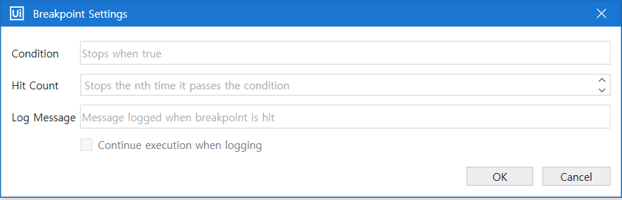 + 조건없이 Breakpoint에 로깅만 걸어두면 소스상 Write Line없이도 로깅이 남기 때문에 편리
