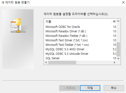 ODBC 설정에 들어가서 '추가'를 누르면 다음과 같이 뜬다.