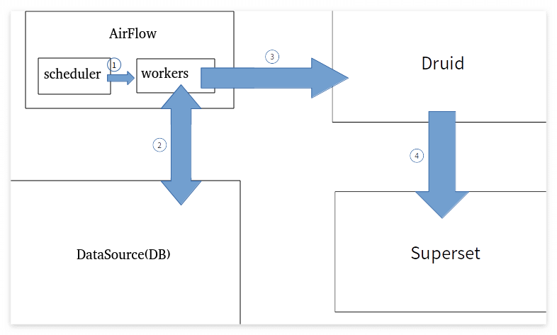 4) Druid는 Superset에 연계되어 데이터 시각화 및 통계를 제공한다.